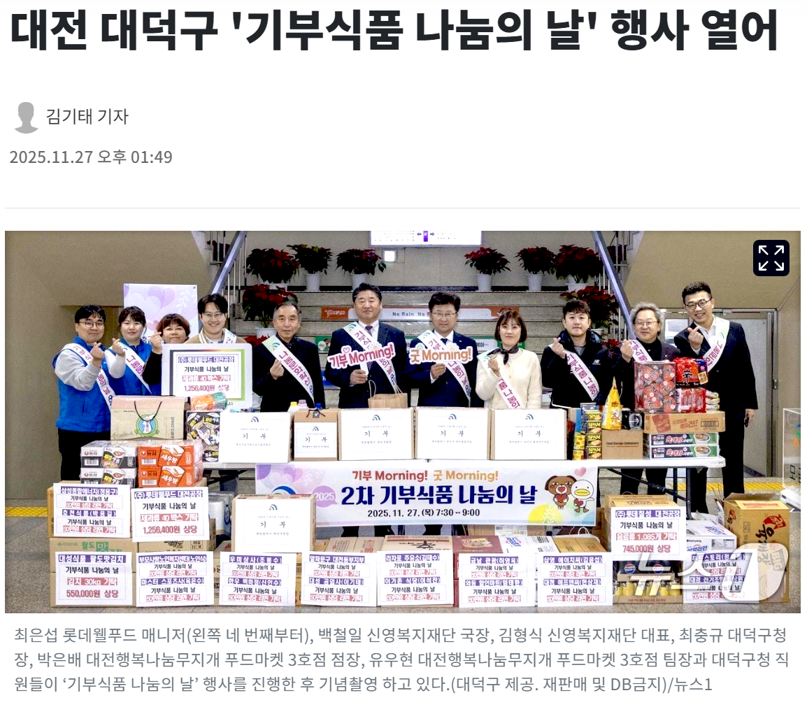 대전 대덕구는 11월 27일 구 본청과 동 행정복지센터, 사업소 등에서 ‘기부식품 나눔의 날’ 행사를 열고 나눔을 실천했다. 이번 행사에는 사회복지법인 신영복지재단(대표 김형식)과 ‘행복나눔무지개푸드마켓 3호점’ 임직원 등이 함께 참여해 의미를 더했다.